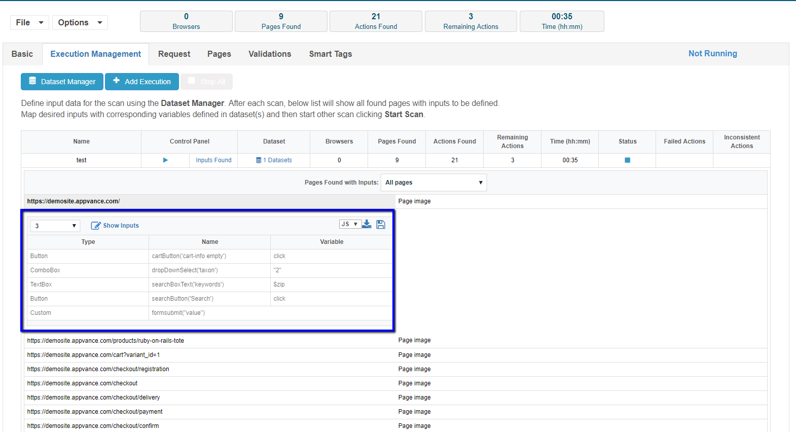 Once we have the first set of Blueprinting done, Execution Management shall show the link with Inputs found, Clicking that link will show all the pages where the scan found the inputs.