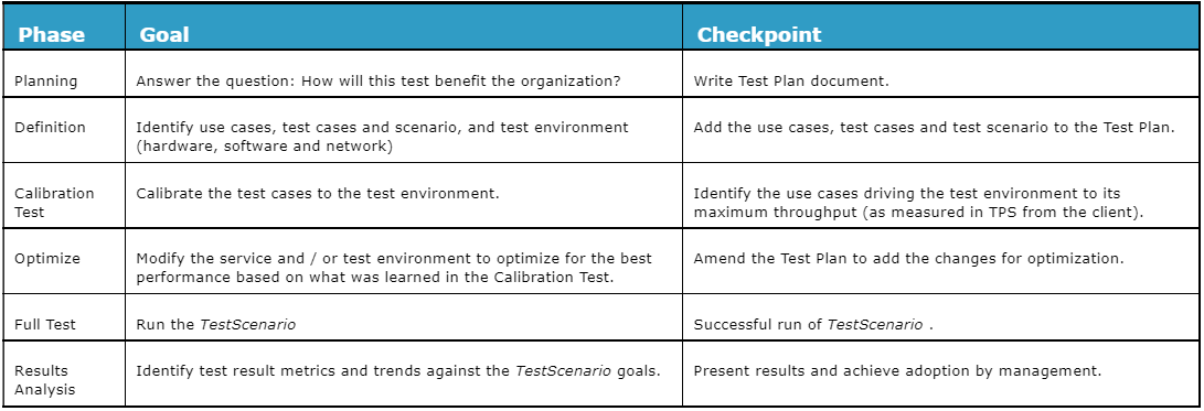 Test Case – describes the inputs to an individual test. For instance, for a test comparing service throughput at low and high levels for message payloads, define 2 test cases: the first makes requests to the service using an XML document of 500 bytes and the second sends XML documents of 10,000 bytes
