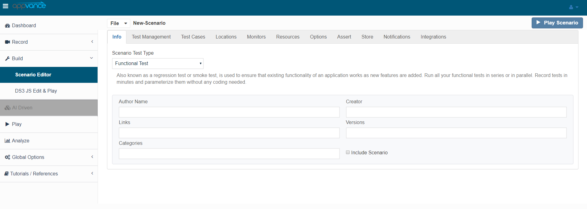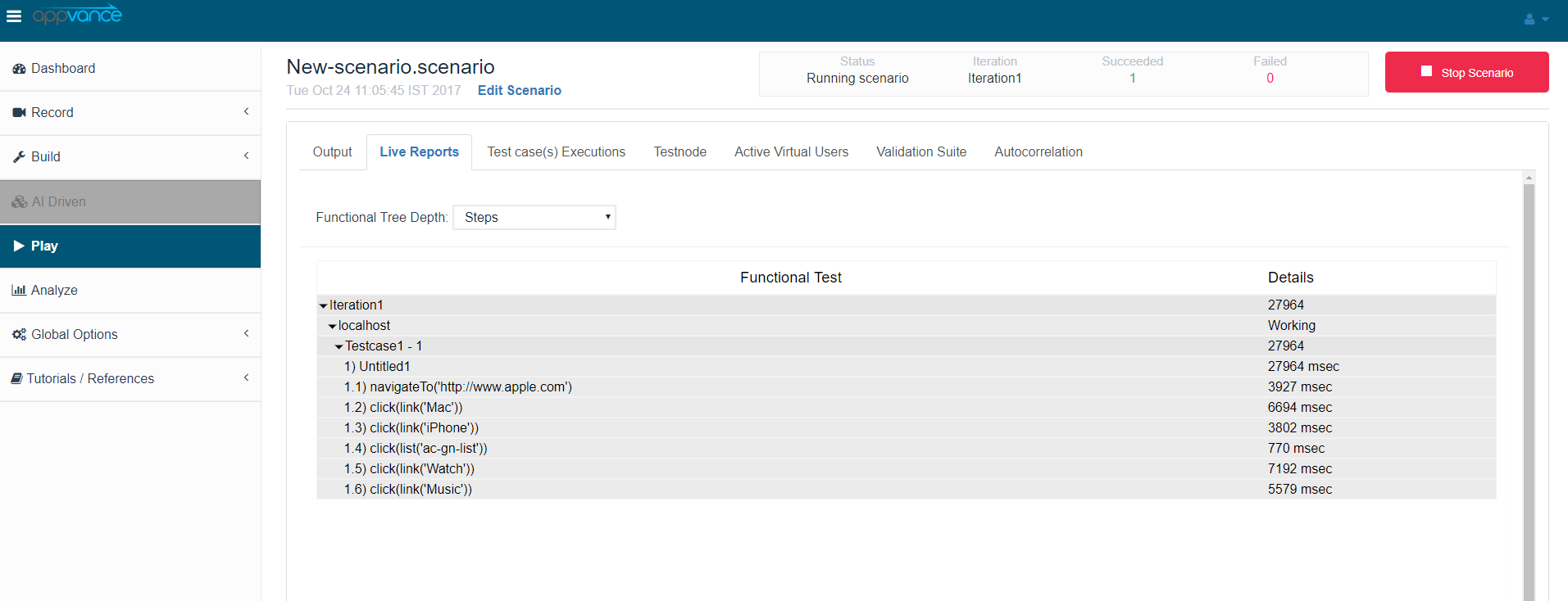 Create a functional test scenario using the Appvance Designer script created in the above step and save the scenario. The screenshot is given below.