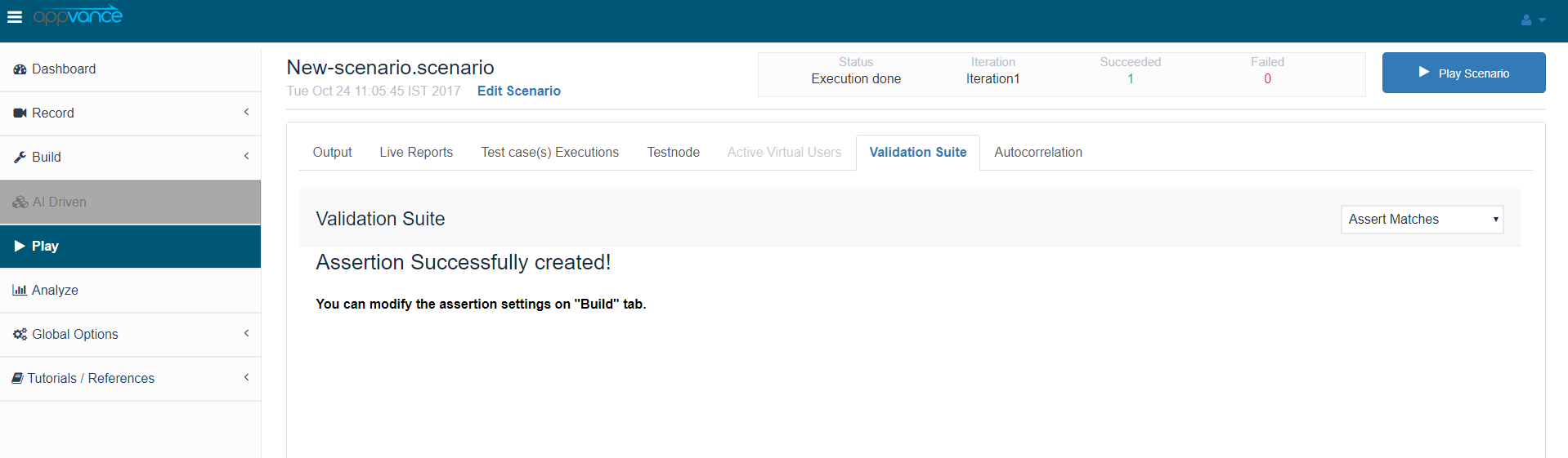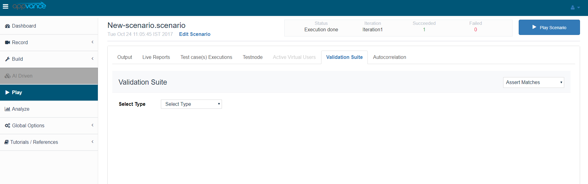 Once the test is completed successfully. Click the Validation suite tab and from the drop-down select the assertion of our choice