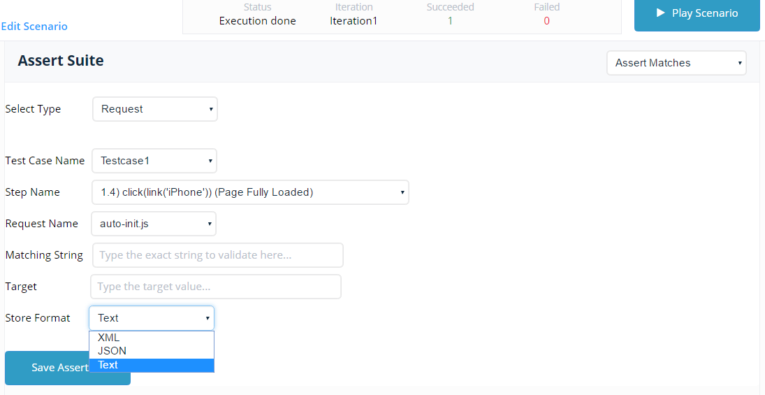 After we add the assertions in the test controller we can view the same in Scenario Builder (SB) by Clicking on Save assertion. Once the assertion is saved User needs to refresh the Scenario Builder page to see the changes. Users should navigate to the Assert suite tab of the Scenario Builder page. The screenshot of the below is shown below: